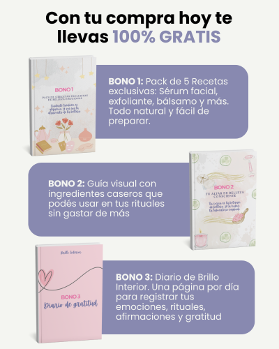 No. Todo está pensado para que uses ingredientes simples y accesibles que probablemente ya tenés en tu casa. Y en los bonos incluimos una guía visual para que sepas qué podés usar sin gastar de más.